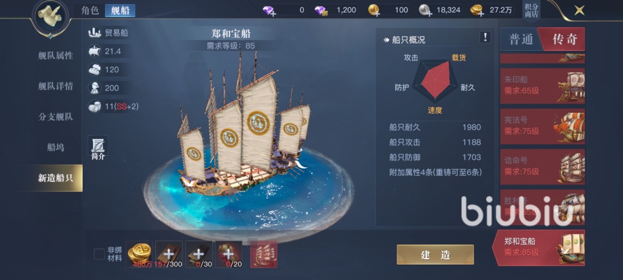 舰船又分为普通和传奇两个种类,如果能够获得传奇战舰,那么对战力的提升是非常大的。传奇战舰普遍可以附加6条属性,比普通战舰要高得多。传奇战舰可以通过消耗贸易币,木材,铁块,传奇造船材料等来打造。而普通战舰只需要木材和铁块以及贸易币就能够获取。
