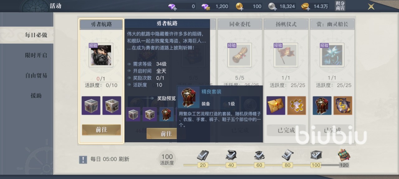 勇者航路是每天必做的任务,最少三人组队才能够进入,其中通过等级又分为燃烧港湾,困兽遗迹,战栗仙境等不同的副本。每一个副本中都有两个boss,击杀这些boss就能够获得人物的精良套装,以及船只的装甲、装备设计图纸和卓越魂石等奖励。