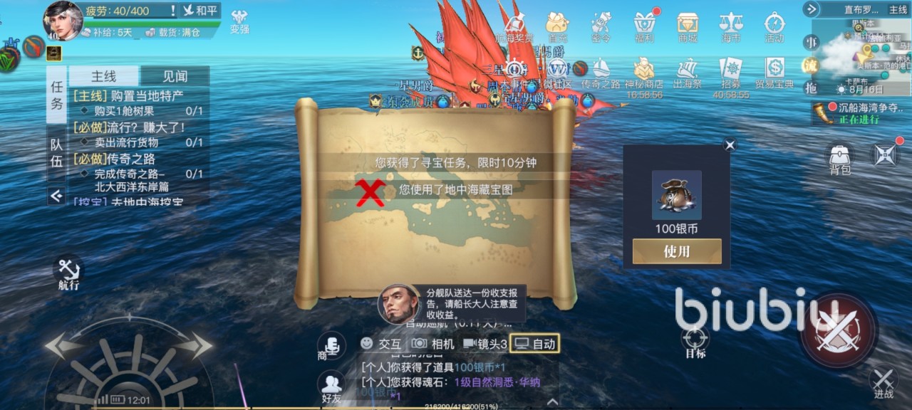 通过这些途径获取的藏宝图,能够在背包中查看到,点击使用就能够自动寻路到宝藏所在的海域。如果背包中有足够的藏宝图,那么完成一张之后可以自动去挖掘下一张,每一张藏宝图的限时10分钟,一般都能够很快完成。如果仅仅是普通的地中海藏宝图,那么大多数情况下都是只能获得一些银币。真正的奖励还必须是紫色的高级宝图。