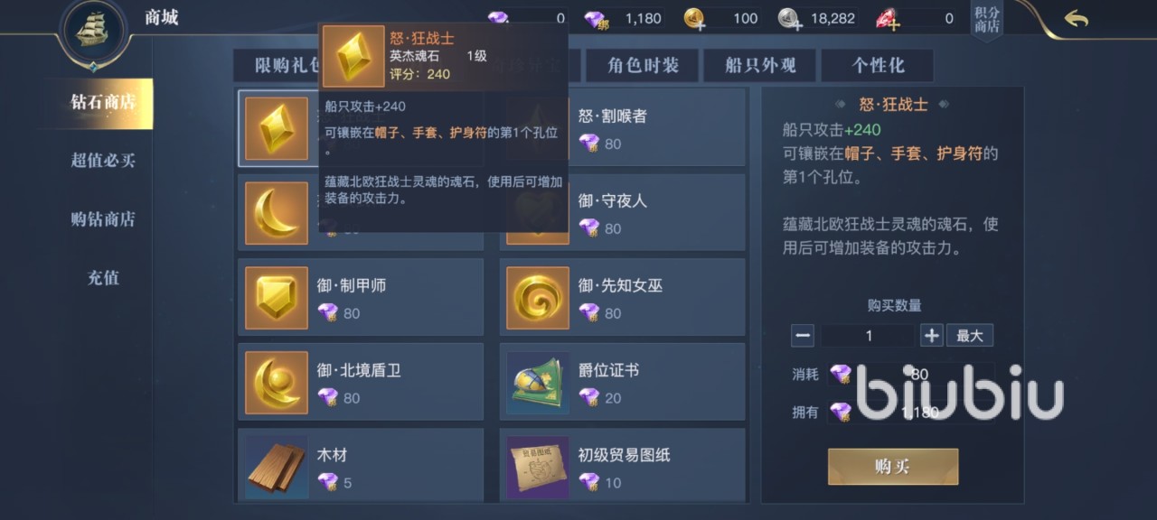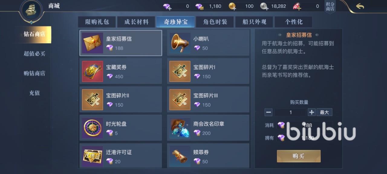 想要进行上述方面的战力增长操作,除了将需要做的活动和副本全部清理完之后,商城中适当的购买一些道具也是必不可少的。例如在钻石商城中购买,魂石自选箱可以开出高品质魂石。在成长材料商店中能够直接购买到橙色品质的英灵印刻。以及红色品质和橙色品质的战斗图纸,用于改造船装。在奇珍异宝商店中可以购买到皇家招募信,想要抽到高品质的航海士,必须经过多次招募。