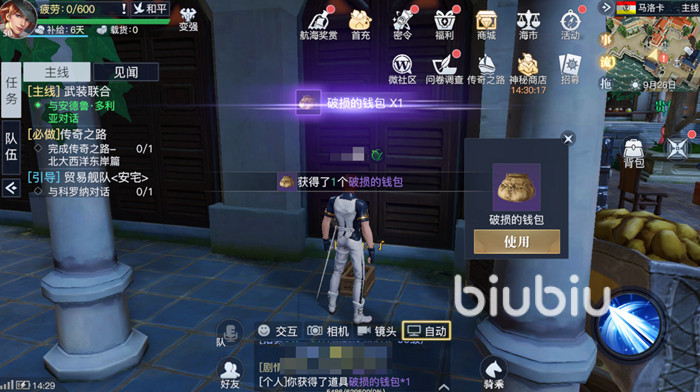 从酒馆出来之后西边有一栋建筑叫做交易所,大家打开地图上也可以通过图标来找到交易所。在交易所旁边有一栋房子的两个柱子中间可以找到一个箱子,打开之后就可以破损的钱包。