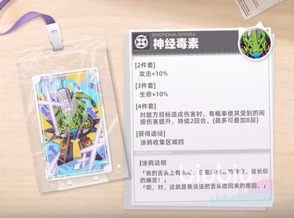 第二套要向大家推荐的涂鸦叫做神经毒素,二件套效果同样是可以增加角色10%的攻击力,三件套效果则是能够提升角色10%的生命值,三件套效果其实就是在游戏中能够增强角色的续航能力。四件套效果对角色对敌人进行伤害时有几率能够让敌人受到额外的间接伤害。这个涂鸦其实非常适合挂机流玩法,因为不需要我们额外做出什么操作。