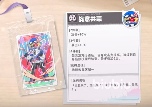 第一套要向大家推荐的涂鸦是战意共荣,这个涂鸦两件套的效果是可以增加角色10%的攻击力,三件套效果是提升10%的暴击率,四件套的效果是在友方行动之后,角色可以获得攻击力的提升,这个效果一直持续到自己释放技能之后结束,该效果最多可以叠加六层。战意共荣这个涂鸦特别适合幽篁月韵这种不用依靠就能就能够打出强力输出效果的角色。使用这个涂鸦最好带一个嘲讽的盾牌,然后在战斗中注意最后一个回合再使用技能。