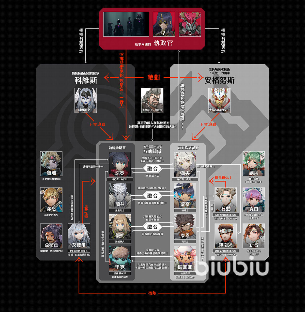 可以看到,这个世界共有两个阵营势力,一个是科维斯,另一个是安格努斯,两者是敌对的状态。其中,诺亚、兰兹、优妮、里克原本属于科维斯阵营,而弥央、圣奈、泰恩以及玛娜娜则原本属于安格努斯阵营,不过他们都脱离了原先的势力,而被这两个阵营的老大下令追杀,如此他们几个也就形成了互助的关系。