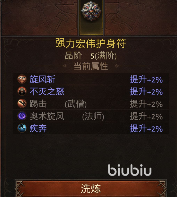 分解一个护身符,可以得到10个升阶材料,1-4阶的护身符,都是可以通过消耗20个升阶材料进行升阶的,每次升阶都可以给护身符附加一个技能,但是呢这个技能是全职业随机的,并且只能+2%,5阶的护身符,基础技能是旋风斩+2%,升级到5阶,多了4个技能,因为一共有6个职业嘛,所以升阶获得本职业技能的概率是1/6,运气还是比较好,随机到了不灭之怒和疾奔两个本职业技能,另外两个技能都是其他职业的。