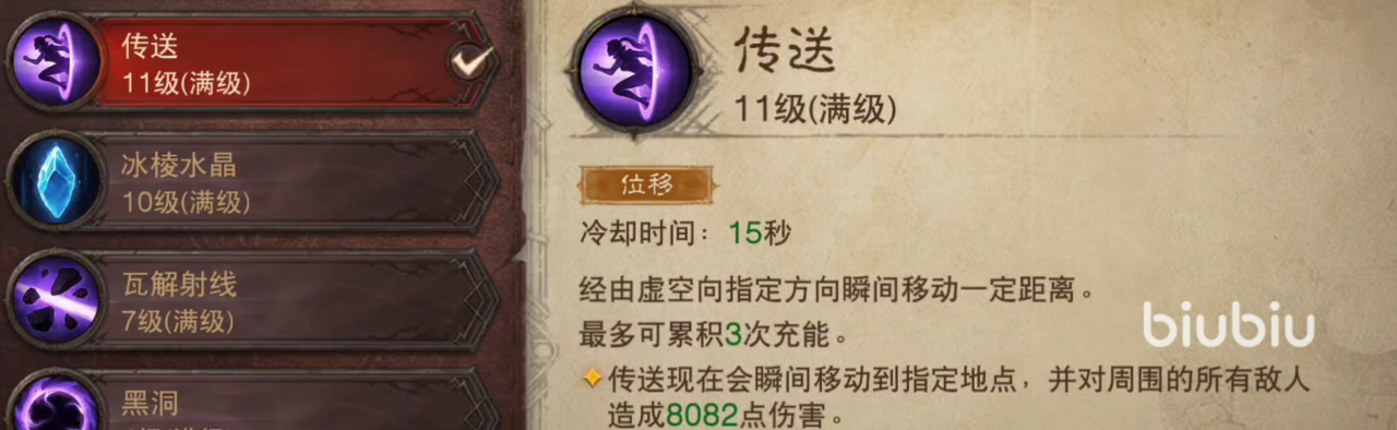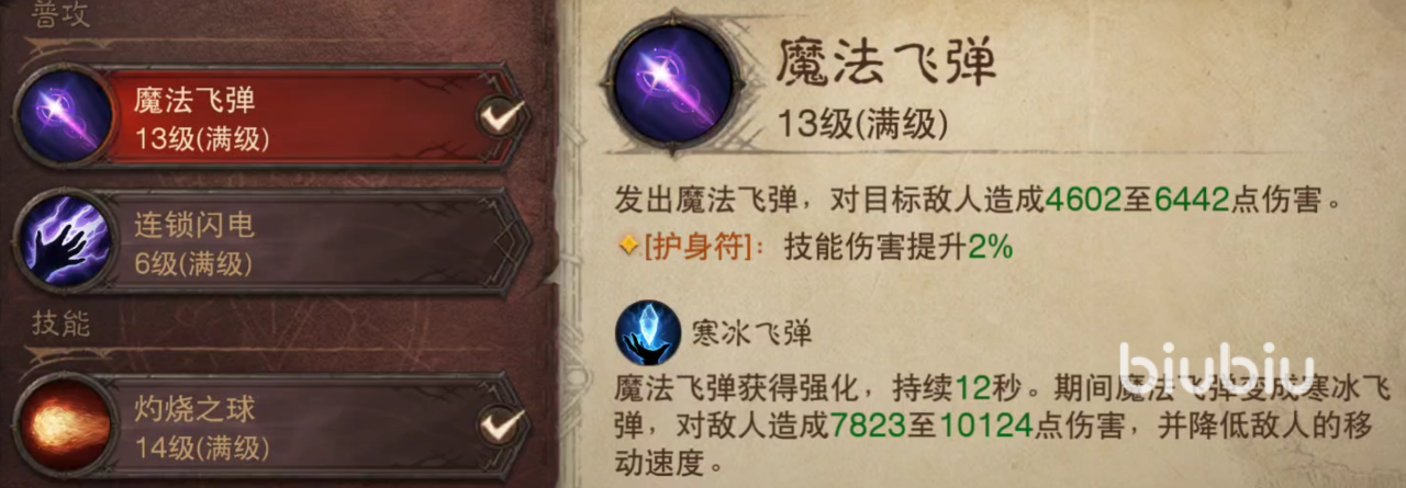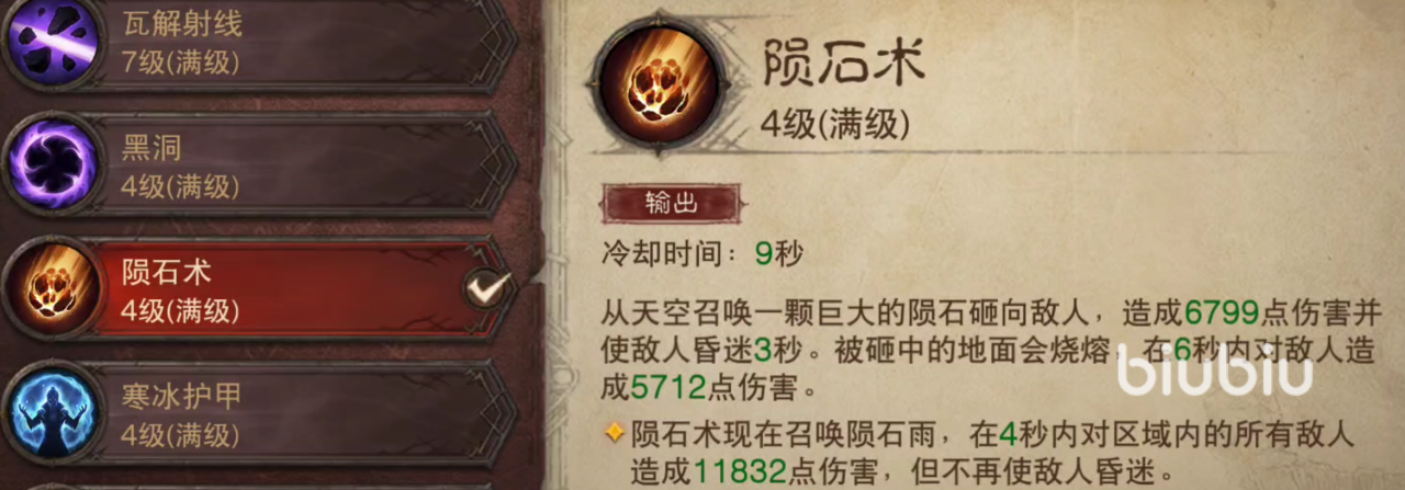 第1个技能选择魔法飞弹,技能效果就不用再多说了,常用的输出技能,第2个技能选择灼烧之球,这些法师在刷怪时最常用的技能,小怪可以直接清理掉,使用起来也很简单。第3个技能选择陨石术,这个技能非常重要,是这一套流派中唯一的控制技能。在使用时需要预判一下石头落下的时间和对方的走位。只要能够打准,强力的控制会让对方痛不欲生。
