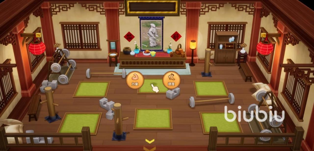 而在修炼房里,小伙伴们只要点一下地上的垫子,就能选择不同的属性来进行修炼了。刚开始的时候,小伙伴们能修炼的主要就是两个属性,一个是力量属性,另一个则是速度属性。