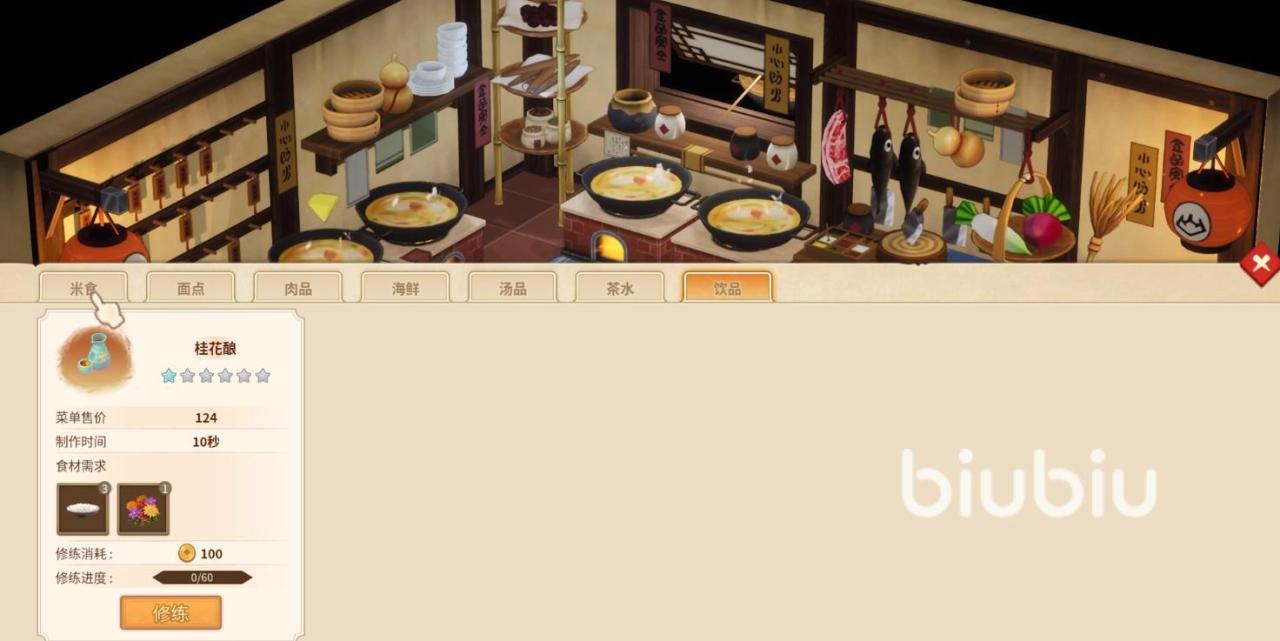 上面只是提到了角色的修炼提升,其实菜品也是能修炼提升的,这个修炼的地方就是厨房了,同样要等到晚上的时候,厨房开放以后点击进入,就能选择一个菜品进行修炼提升了。提醒一下,小伙伴们在修炼房以及厨房这两个地方安排完相应的修炼以后,就能结束当天的工作来休息了,等到第二天,在营业以前就能收获相应的修炼成果了。