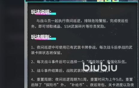 4、重置:每夜巡逻一周,早上5:00重置。重设后,“补给币”、夜巡背包、关卡进度、夜巡 BUFF等 BUFF,都会在“探险币”的基础上重新设置。