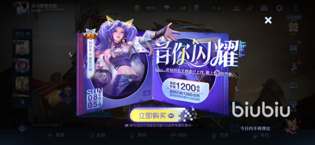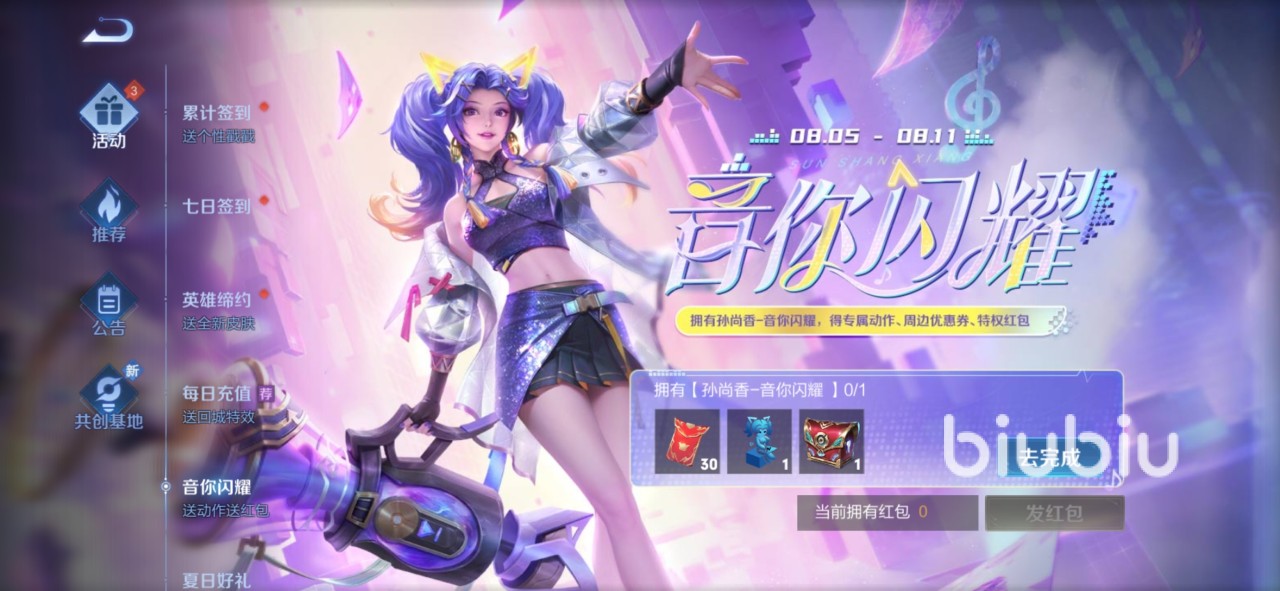 孙尚香的音你闪耀皮肤已于8月5号正式上线,玩家们只要完成一些相关的孙尚香获取以及对战任务就可以获得150点券的折扣,最低1200点券即可拿下,这款建模风格还是技能特效都非常完美的皮肤可以说是非常值得入手的。