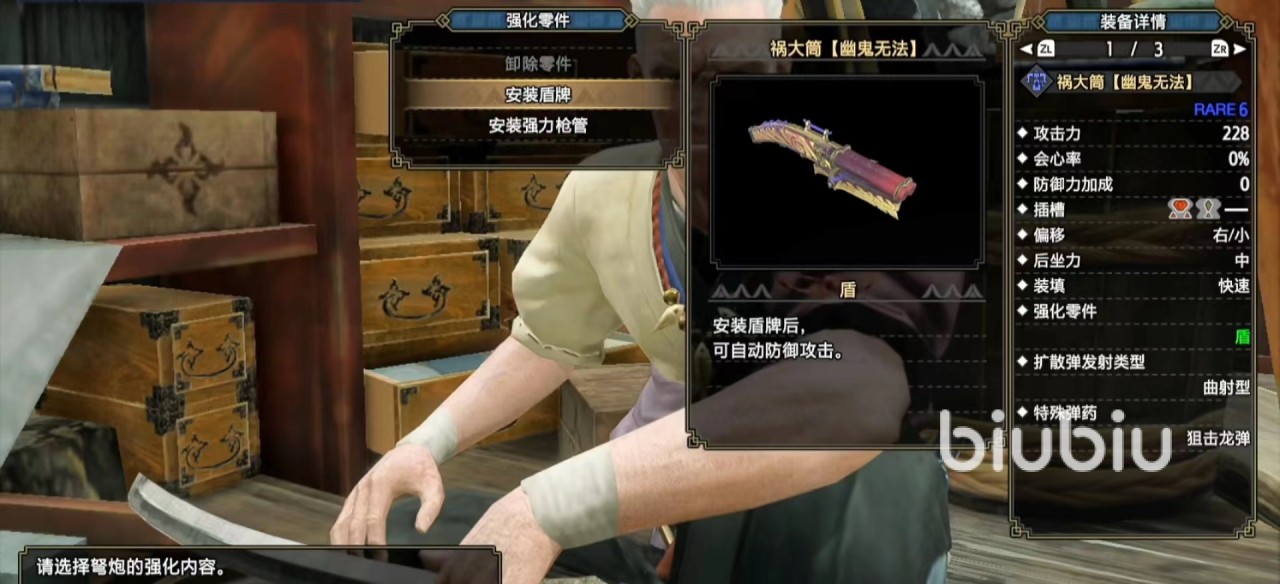腰部的妃蜘蛛腰是这套配装的核心,多孔位的设定非常适合散弹。最后的零件改造可以让盾牌的抗性加强,大大提升了玩法的容错率。