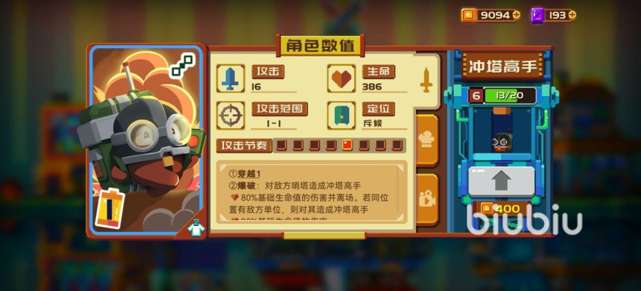 3、第三点:想要进攻敌人,那么肯定要优先解决掉敌人的箭塔。这时镭射这种就非常重要,带上他可以轻松磨掉对方的箭塔。亦或者是选择炸弹人,这个算是萌新杀手了。