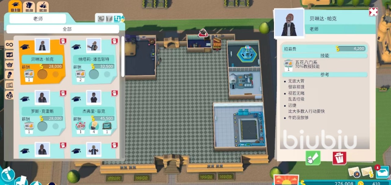 结余开支主要体现在员工、老师的人力管理方面。游戏内的老师和员工都具有技能,个人的技能越多,那么薪资就越多。但很多时候需要他们做的就只有一件事情,此时玩家选择技能和工作对应的人员即可。当然也不要为了节约钱招聘有负面情绪的人员,这样后期反而会亏损。