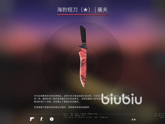 3.海豹短刀屠夫配色,推荐磨损为略有磨损,市场价现在为1500元,该短刀在游戏中的视觉效果是比较狭长的,能够远超短剑等道具的手感,能够增加步枪手近距离频道的手感,是很多步枪手比较喜欢的一把刀。