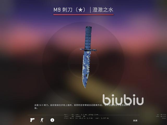 1.M9刺刀的澄澈之水,这里推荐选择崭新出厂的,不过价格比较高1400一把,但是这把刀的配色是全部价位当中性价比最高的一把了,还有独特的切刀方式,厚重的持刀感觉能够让步枪玩家有一种非常良好的手感,能够进一步提升步枪手的射击手感。