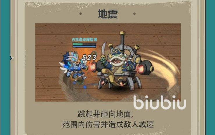 它的地震技能是跳起来向地面砸去,是个范围性的技能,在这范围内的敌人会受到伤害并造成减速。不过这个技能有前摇,玩家可以在它脚下出现红色法阵的时候就快速撤离。