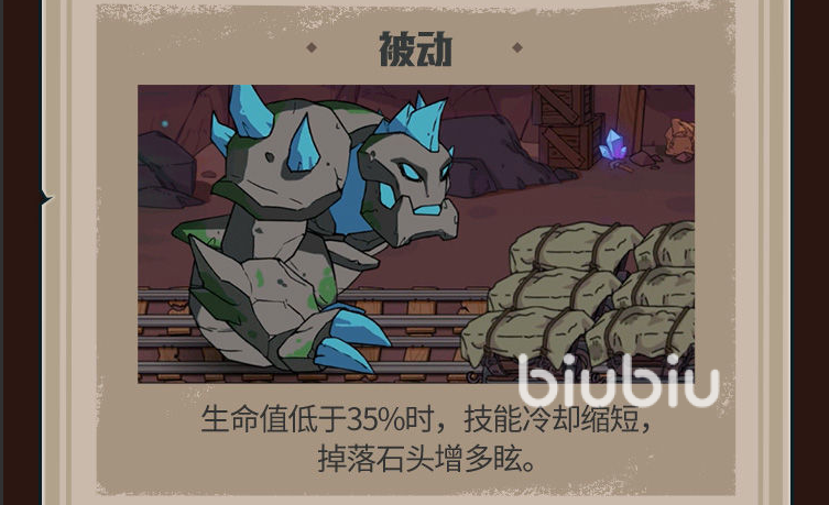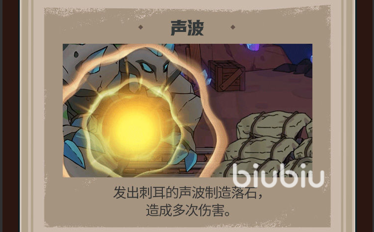 声波技能是大地兽发出刺耳的声波制造落石,可以造成多次的伤害。它的被动是当大地兽的生命值低于百分之三十五的时候,技能的冷却会缩短,并且掉落的石头会增多。