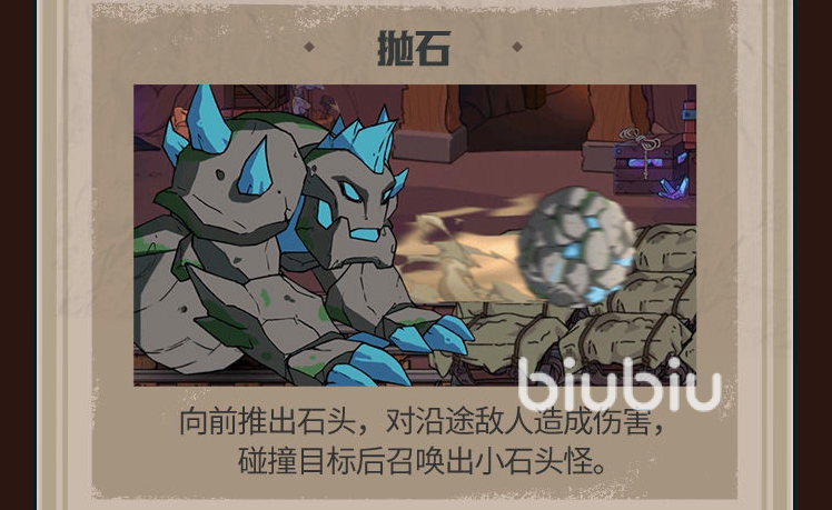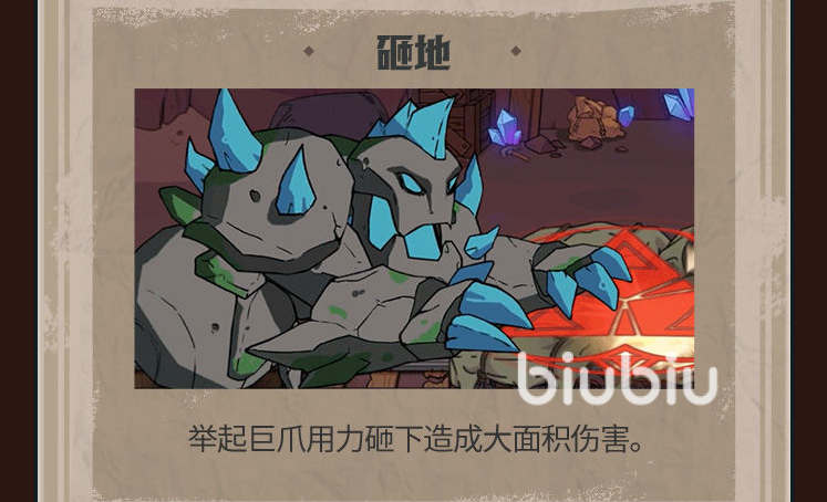 下面介绍一下它的技能,首先是砸地技能,这个技能就是大地兽举起巨爪用力的砸下来,并造成大面积的伤害。它的抛石技能就是向前推出石头,对沿途的敌人造成伤害,并且在碰撞到目标之后会召唤出小石头怪。