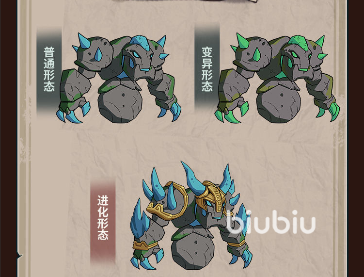 大地兽有着坚硬的外表,但还有一个隐藏着的柔软的心。孤寂的它为了追求心中所爱在矿洞中来来回回的寻找。他一共有三种形态,第一种普通形态就是常见的类型,第二种变异形态的部分肤色发生了改变,第三种进化形态的大地兽盔甲更加完整。