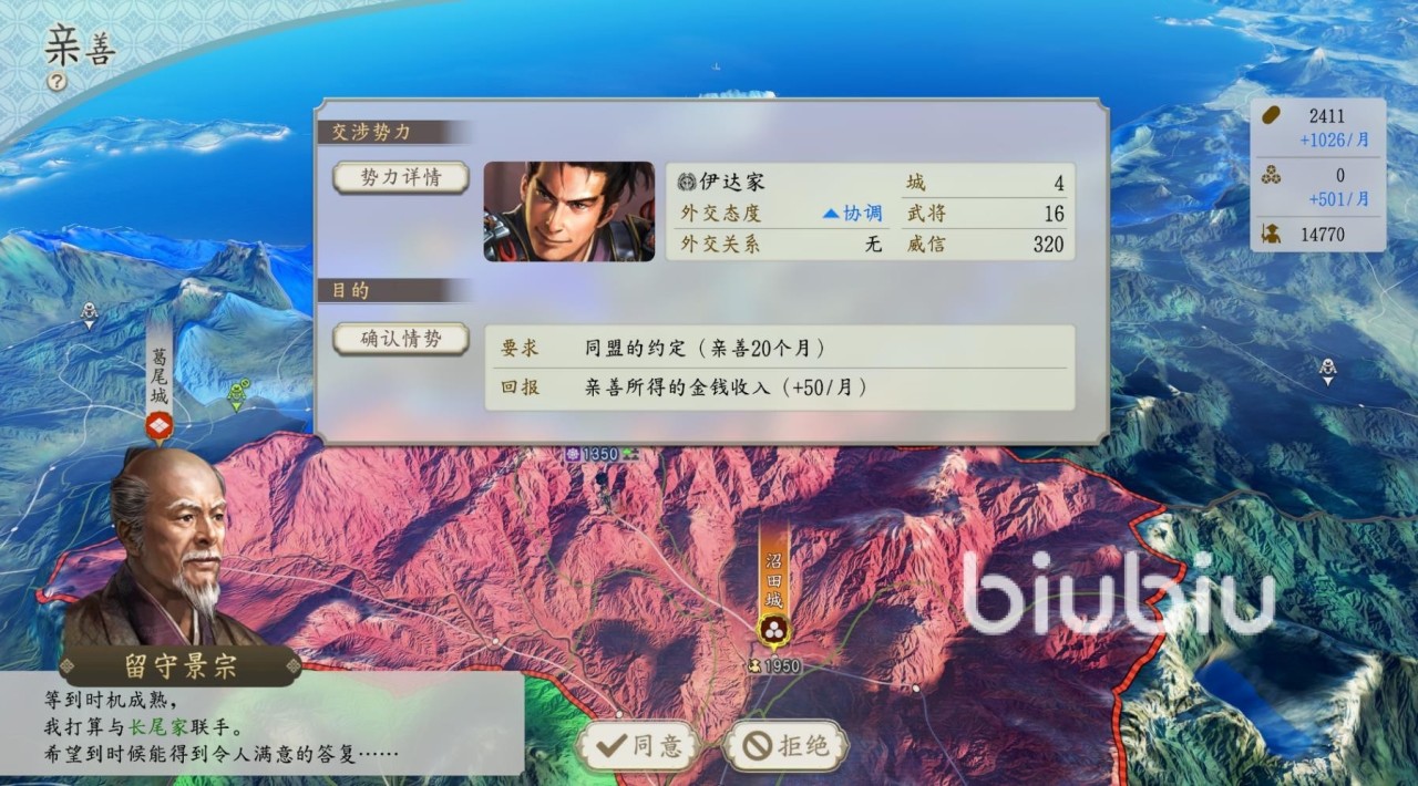 上来之后直接解除军团,因为新发田还是需要玩家自己来守,先做完两个新手任务,因为需要四处征战的缘故,所以比较缺粮,直接选择米行加入会。游戏内第1天的时间就要发出沼田,先出发去占郡城,时间非常紧迫。伊达家会来表示亲善,需要多关注动向,保持不弱不强的状态。