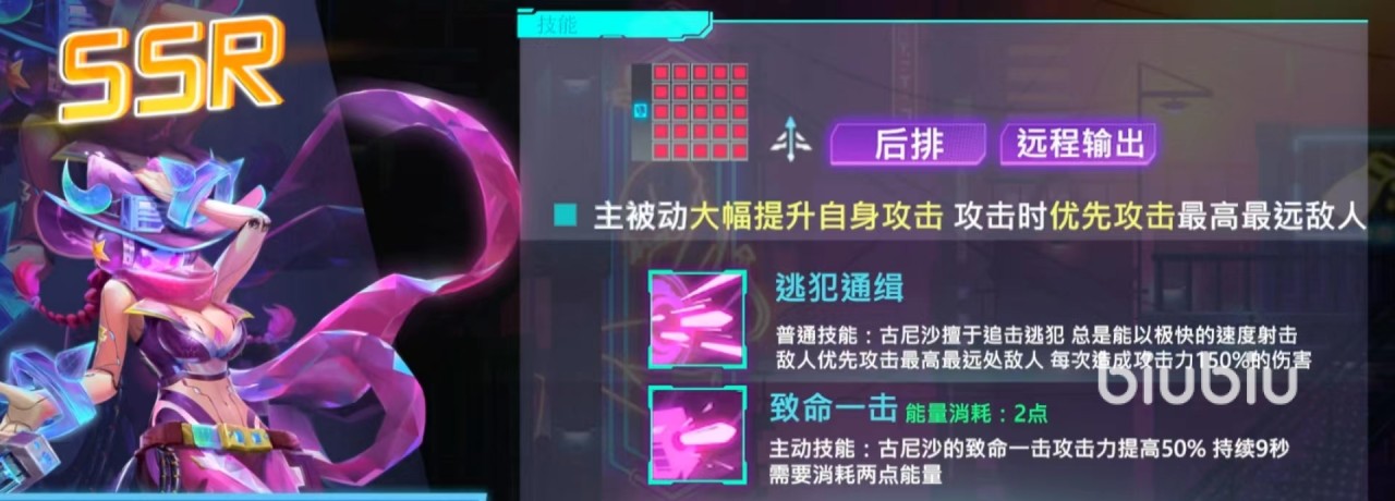 古尼沙的定位是输出位的射手,其技能“逃犯通缉”除了加攻速、加伤害以外,自带无限攻击距离的机制,而攻速、伤害、攻击距离的加成都非常契合古尼沙。并且这个技能还会让古尼沙优先选定最高最远的敌人,要知道常规的站位中最高最远的敌人一般都是对手的C位,相当于古尼沙自带自瞄。不过成也这个机制,败也这个机制,古尼沙因为过于强势很容易被对手针对,对手要是在后上方摆个坦克,古尼沙的输出效率将大大折扣。