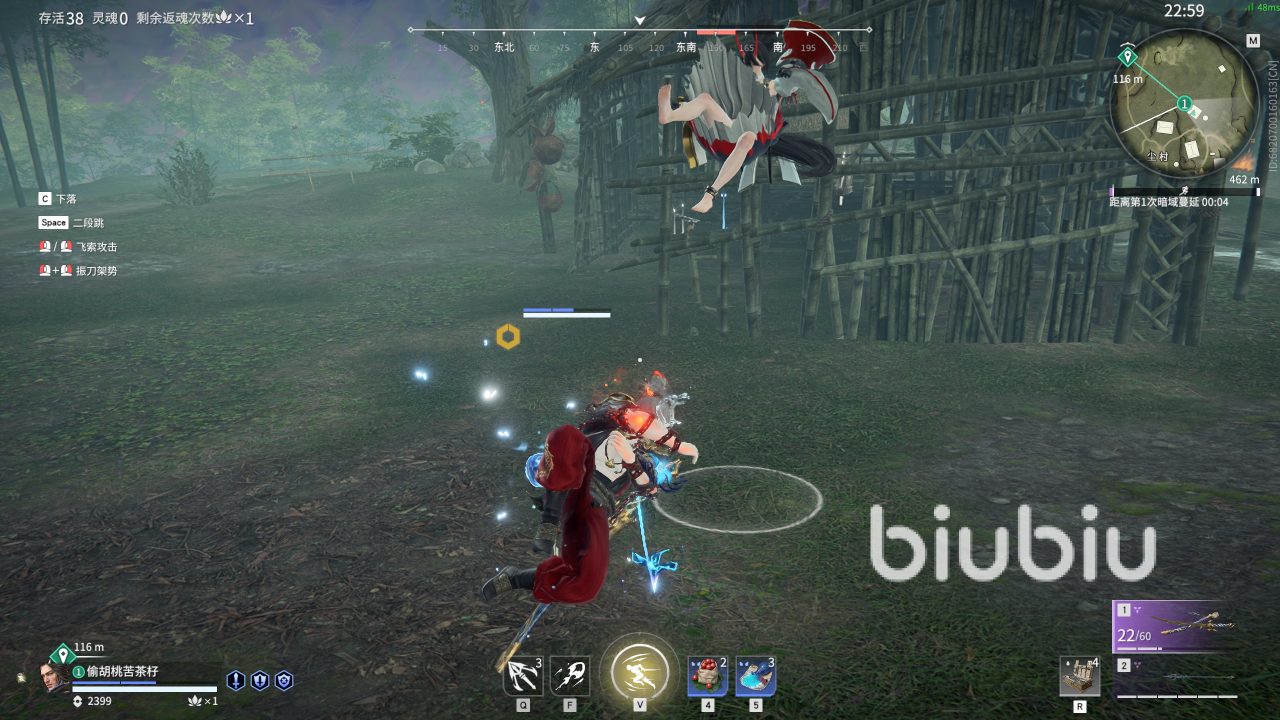 重点来了,在对手升龙的同时,左手按住A或D键其中一个,这一操作一开始会很别扭,时间长了自然就习惯了,这一习惯能让我们快速落地,我方角色单脚落地后,马上出钩锁钩到对手身下。这里再给大家安利一个小技巧,利用屏幕中间的白点瞄准后,Q和左A一起出,这样能实现秒出钩,大大减少钩锁的前摇。