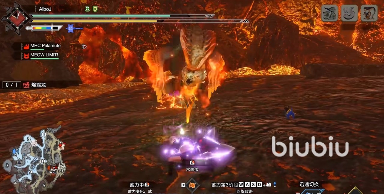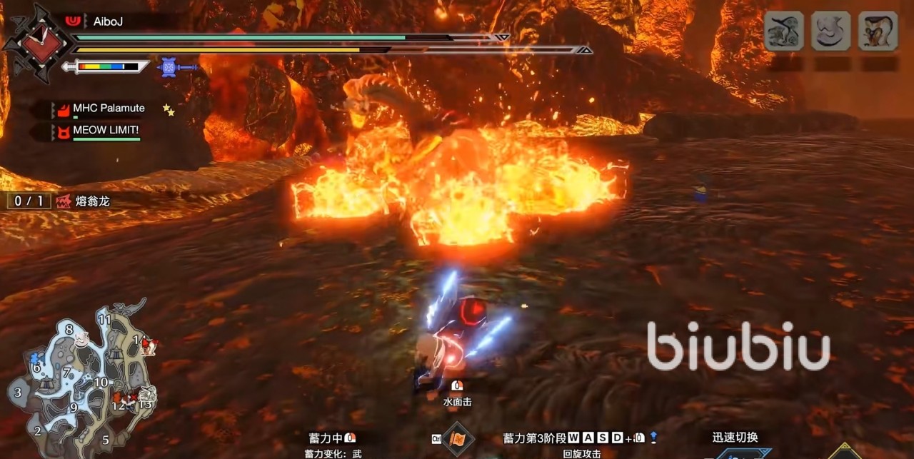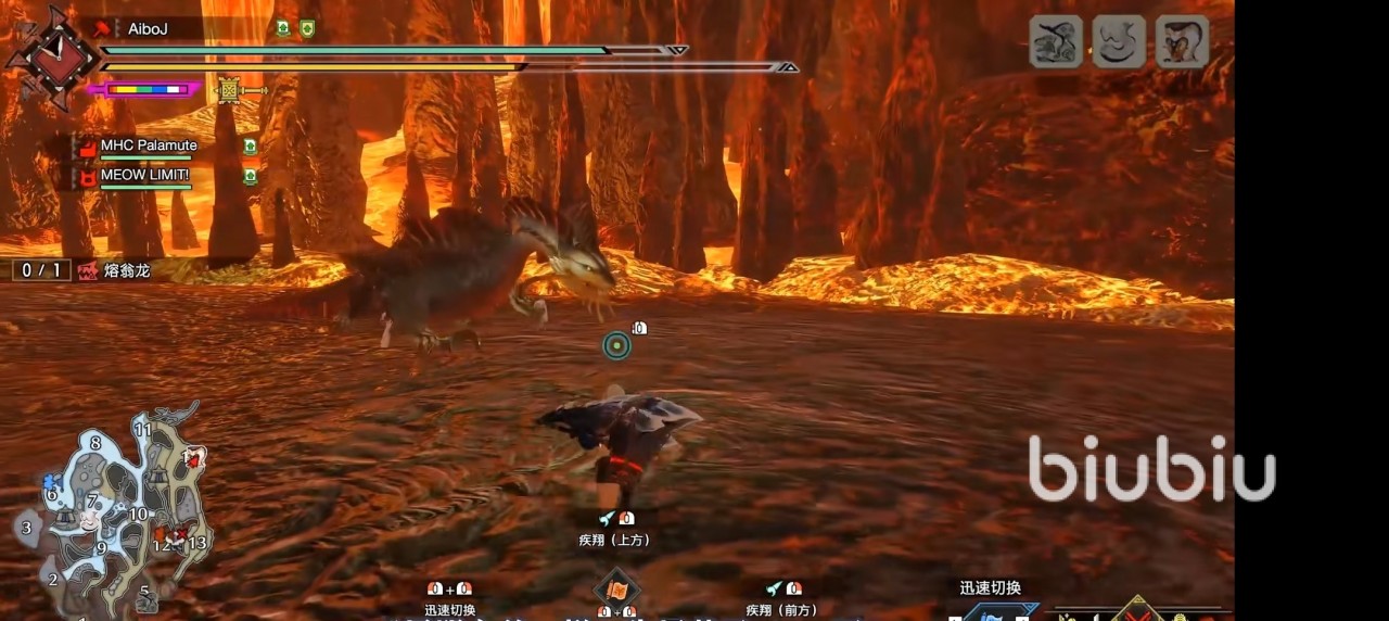 熔翁龙还有一个招牌招式就是二连钻地,召唤出会爆炸的岩浆石头。这里的技巧是在它第1次钻地的时候,不要去到处找它,原地不动就可以。等它使用第2次钻地的时候,直接往上拉挂到天空中拉高一点,不然会被尾巴拍下来。等它的尾巴拍完之后落下来对准头部再来一顿输出,如果装备给力,现在已经可以结束战斗了。