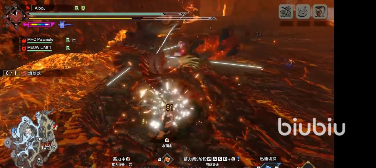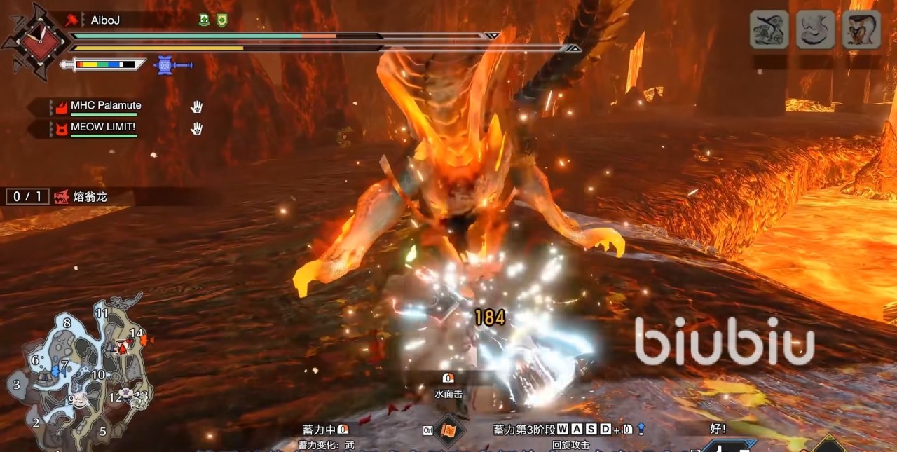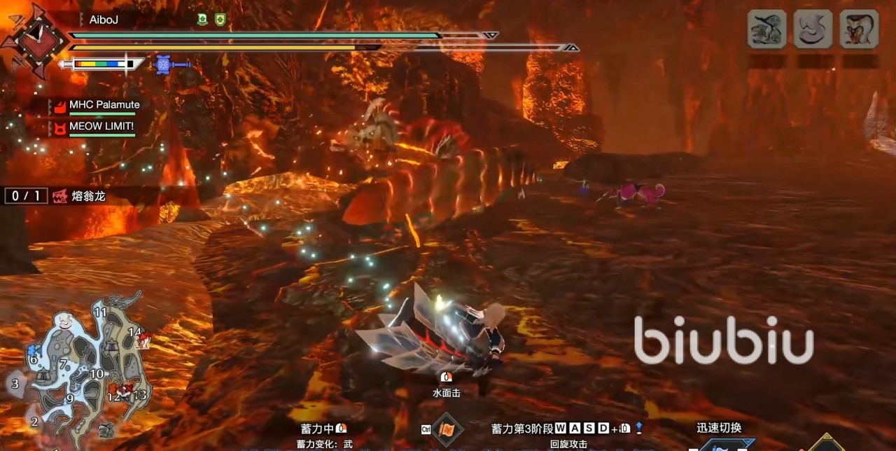 等到熔翁龙进入过热状态的时候,打击的伤害会增加,攻击发光部位还有可能出现炸膛。这时熔翁龙会放出大招火球,直接砸下来,造成大范围伤害,所以距离需要提前拉远。当释放出扇形岩浆的时候,注意看岩浆系列的方向,在岩浆中间就能够躲开。之后继续输出能够打出炸膛倒地,一段时间后将会又进入怒气状态重复转圈,和之前同样处理就可以了。