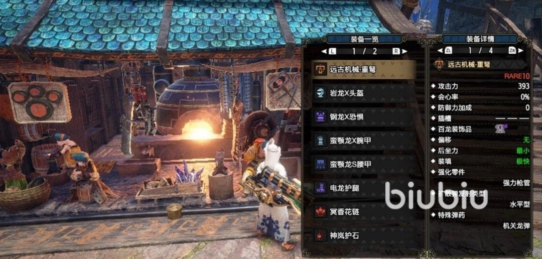第四套是远古重弩,武器选择远古机械-重弩,防具选择岩龙头盔,钢龙恐惧,蛮鄂龙腰甲,电龙护腿,冥香花链,神岚护石。强化零件为强力枪管,特殊弹药选择机关龙弹。