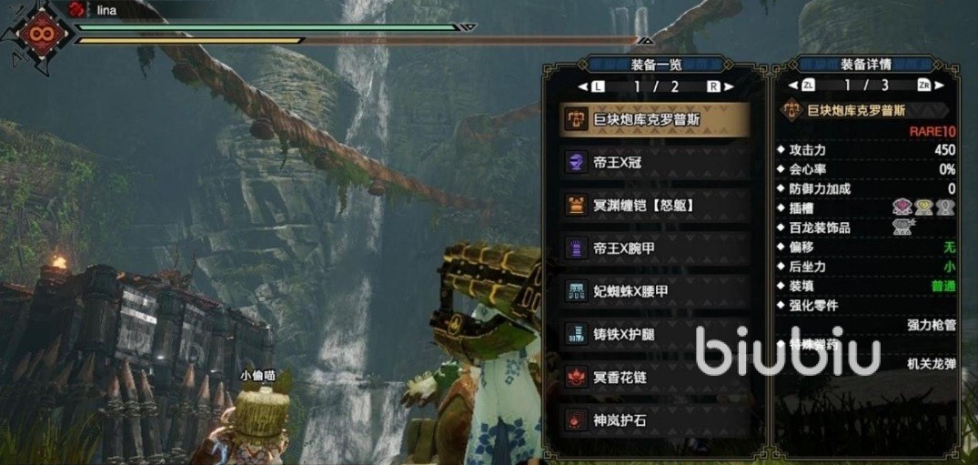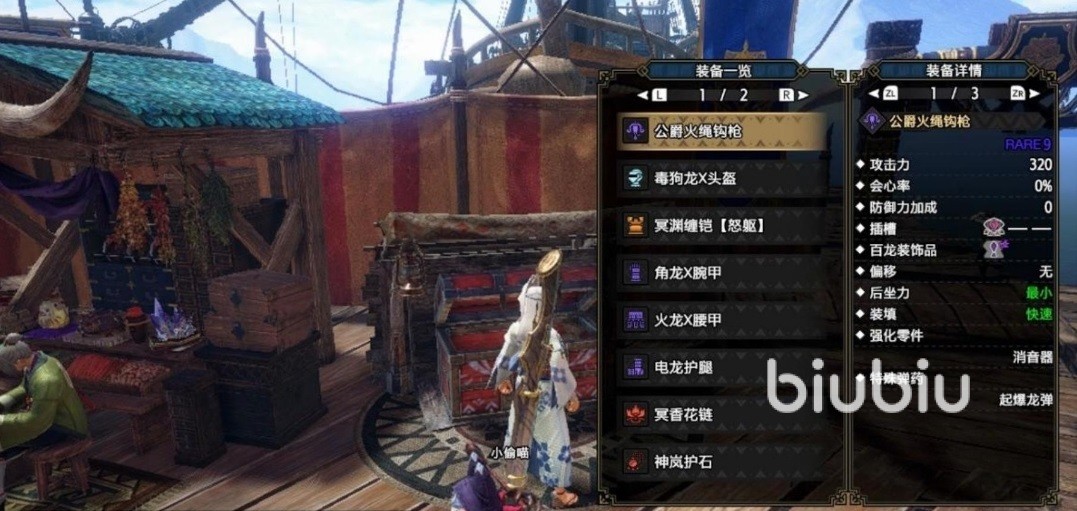 第1套是贯通轻弩配装,武器选择公爵火绳钩枪,防具是毒狗龙头盔,角龙腕甲,火龙腰带,电龙护腿,冥香花链,神岚护石。公爵火绳钩枪的强化零件选择消音器,搭配起爆龙弹。