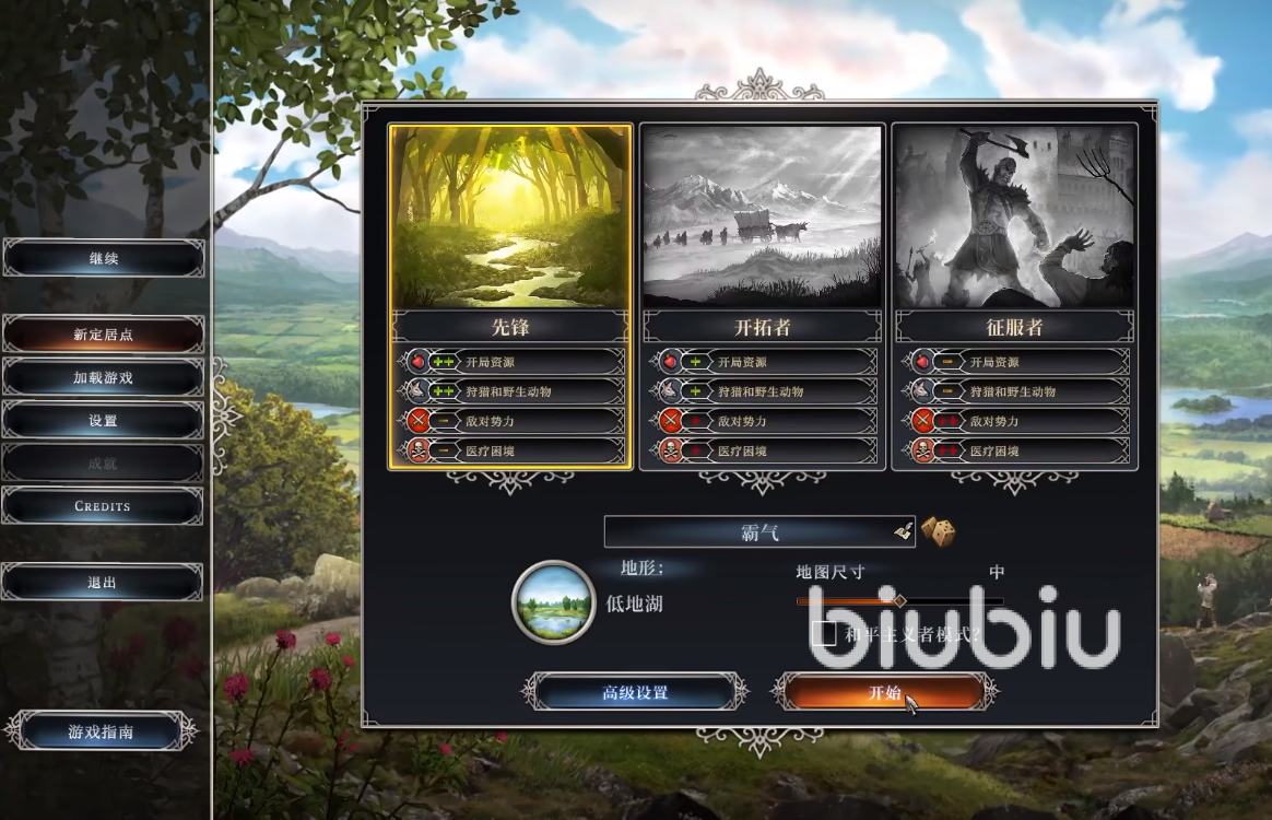 游戏一开局玩家需要选择难度以及创建定居点,新手小编建议大家从最简单的先锋开始,然后在地形的选择上可以选择低地湖,这里资源比较丰盛,填写名字,然击开始游戏,这里会看一段剧情动画,看完之后可以在整个低地湖区域创建定居点位置,一定要看好,这里可是有狼存在的哦,不要直接创建在狼窝了,比较推荐湖边附近,可以更好地生存。