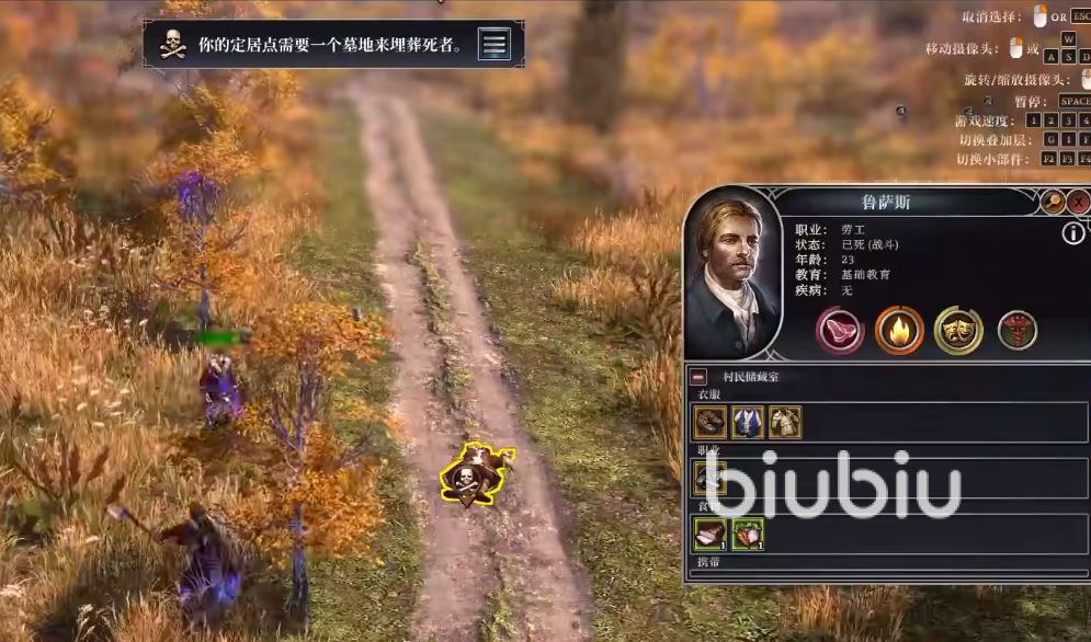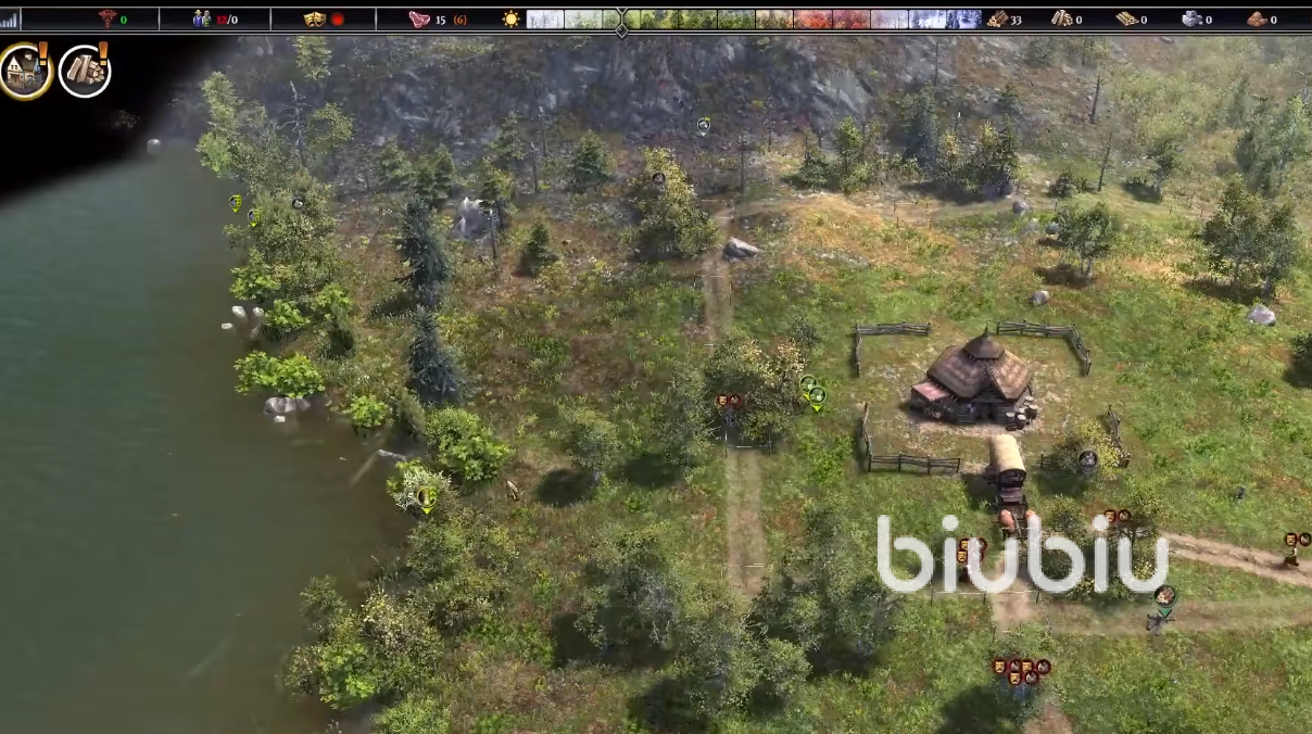 创建大本营之后,玩家就需要在附近砍树获取资源了,初始村民数量是12个,正所谓想发展先修路,玩家要将自己大本营附近的杂物清理干净,铺出一条道来,点击每一个村民可以看到其详细信息以及擅长的领域,游戏前期要尽可能的创建房屋,为所有的居民提供生存场所,前期的食物可以通过采集获取,在湖边最大的好处就是食物比较多,在左上角会有系统提示,如果柴火或者房屋数量不够,玩家就需要去砍树获取更多的柴火,按照提示建造劈柴机。