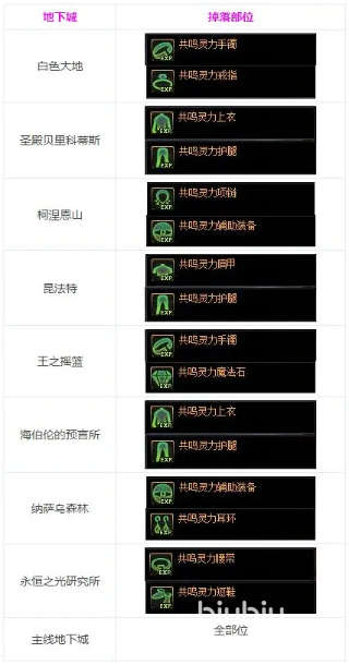 只有普通地下城的冒险,【共鸣灵力】装备会掉落的噩梦级难度,系列装备不会掉落的英豪模式,不同的地下城掉落的部分也是不一样的。掉落的“共鸣灵力”装备条目受到地下城难度的影响,等级和其他史诗作品一样。