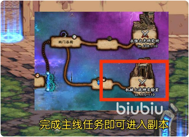 从这里开始就没有任务提示了,玩家可以从“纳门洛斯”往下边走,这里就可以看到“机械七战神实验室”副本,也就是从这个地方可以进入。