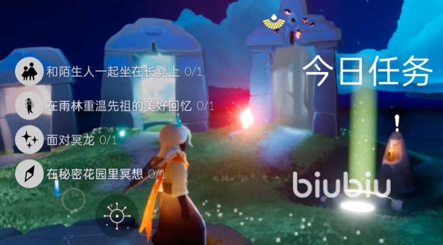光遇每日都会有四个任务,第一个任务是和没有加好友的陌生人坐在长凳上即可,第二个任务是回忆先祖记忆,先祖位置在雨林第一道铁门开门后的四方院左侧位置,玩家只要点火重温先祖回忆即可。