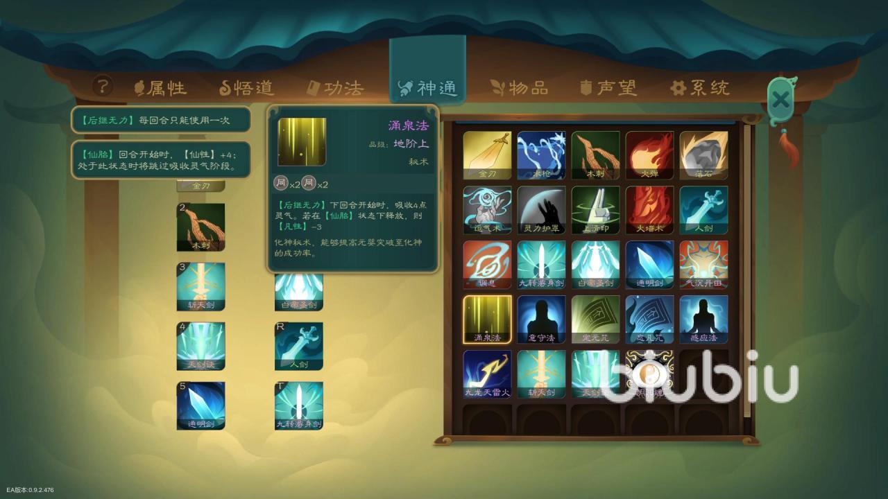 涌泉法可以通过消耗2种不同的灵气,来让你在下回合开始时,吸收4点灵气。若在仙胎状态下释放,则凡性-3,忘凡咒则是只能在仙胎状态下释放,本回合结束时,若仍处于仙胎状态,则凡性-4,定元咒可以通过消耗2种不同的灵气,效果是凡体状态下方可使用。下一次进入仙胎状态时,吸收4点灵气,意守法的效果是下回合开始时若处于仙胎状态,则每有仙性*10,吸收一点灵气。九龙天雷火的效果是使用相生的灵气释放时,淬体+3;使用相克的灵气释放时,塑魂+3。