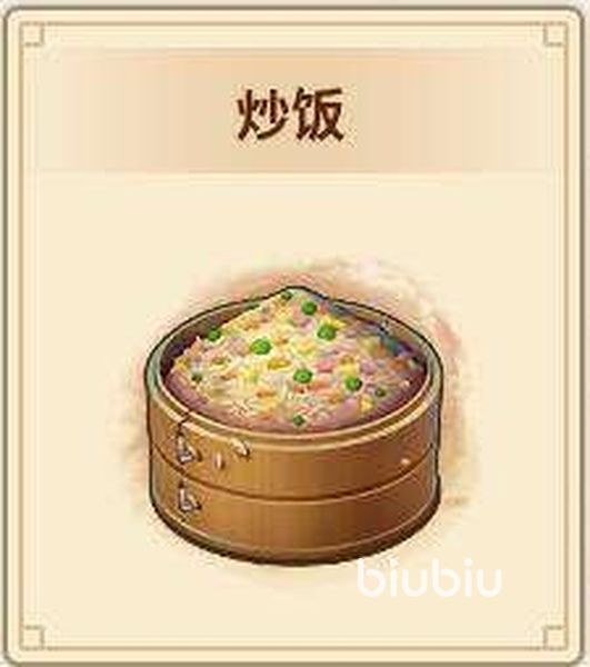 下面我们来介绍一下菜谱配方吧。主食内有炒饭和八宝饭。炒饭我们需要大米x1+叶菜x1,然后需要10秒的制作时间。需要我们先把米蒸熟后再用热油炒制,需要添加一些蔬菜、海鲜、肉蛋类或水果等作为辅料,可以根据辅料不同更改炒饭的名称,炒饭是很常见的一种食品。