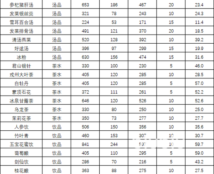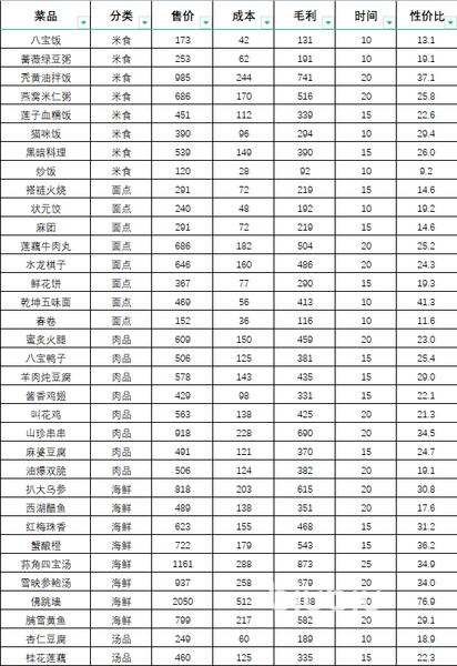 大家可以参照下面我给大家准备的表格来参照性价比详情,从表格中看饮料类的五宝花蜜饮带来的性价比最高,其次就是葡萄酿和茶水类的白牡丹。性价比最低的就是炒饭了。大家可以参照这个表格来选择自己要多准备的菜谱从而获得收益的最高化。但是也不能性价比低的菜品就不上架了哈,游戏里的所有都很重要的。