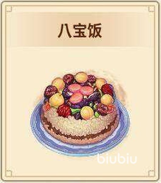 八宝饭需要触发赵灵儿和丁香兰比赛烹调的事件之后才能得到解锁。需要的材料有大米x1+水果x2,我们的用糯米、豆沙馅做成地,上面一层需要有莲子、蜜枣等八种蜜饯制成的图案。然后只需要蒸熟后最后浇上蜜糖汁就可以直接食用了,只需要10秒的制作时间。