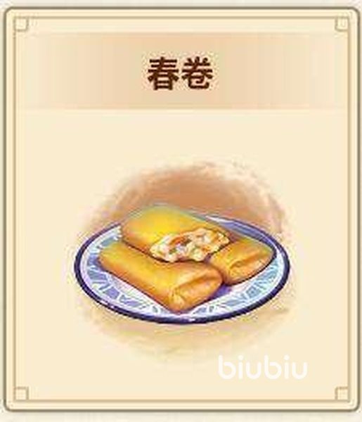 春卷需求的食材有面粉x2+蘑菇x1,我们只需要用面粉做的有韧性的面皮包住里面的馅料,再给它卷成扁圆条形的形状后用中火炸成的一下就好了, 春卷主要有甜咸两种口味。