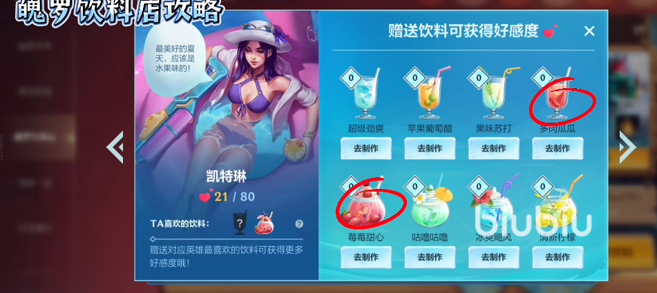 3、将饮料赠送给英雄们。其中,每位英雄都有自己最喜欢的两种饮料。将它们喜欢的饮料赠送给他们,可以获得额外的好感。