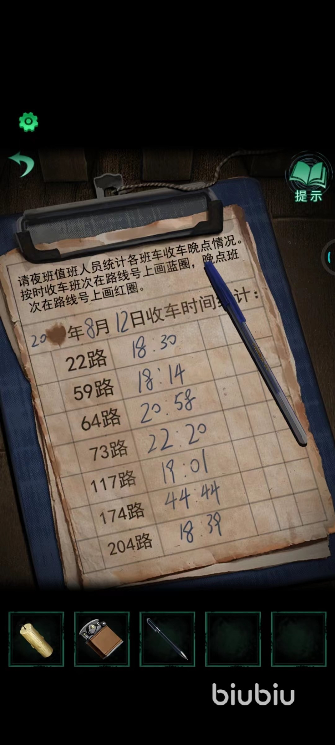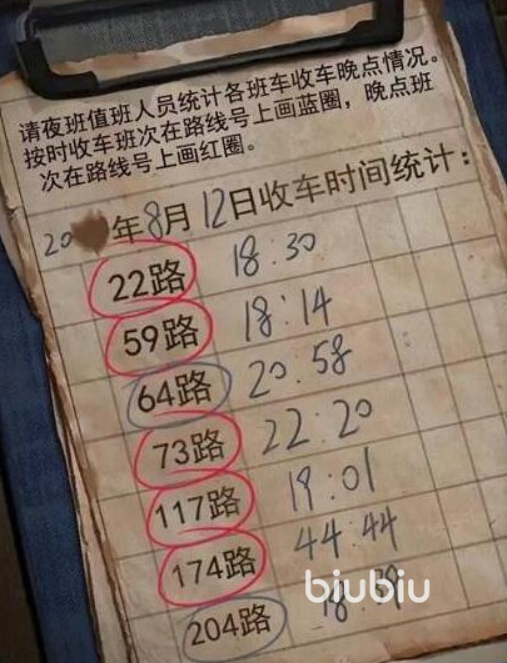 在破旧房屋门口旁的椅子上,我们可以找到一个收车时间的统计表,要求值班人员统计各班车收车的晚点情况,在按时收车的班次路线号上画蓝圈,在晚点班次的路线号上画红圈。在统计表上还放有一支【蓝色圆珠笔】,需要拾取备用。