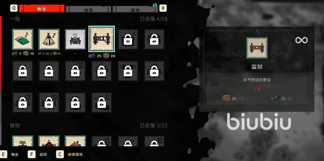 如果玩家们没有事件去收集建造监狱的物资,那么大家可以选择命令教徒们去进行收集,虽然速度会更慢一些,但玩家们可以解放更多的时间去做其他事情。顺利的完成了材料收集之后,大家就可以在教派驻地当中,选择一个合适的地点安放一个监狱。小编建议各位将监狱安放在远离教徒们的区域,这样也方便进行关押。