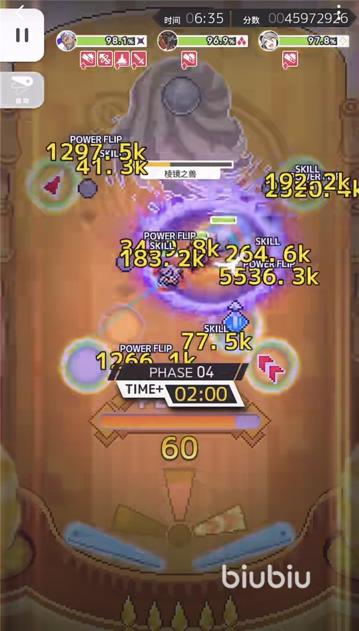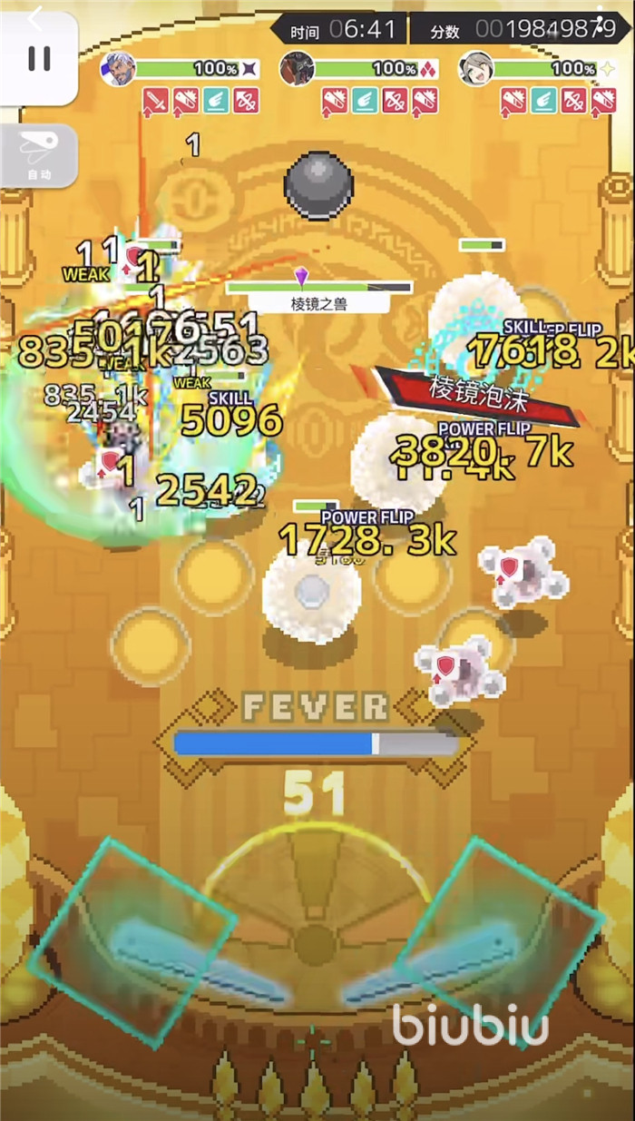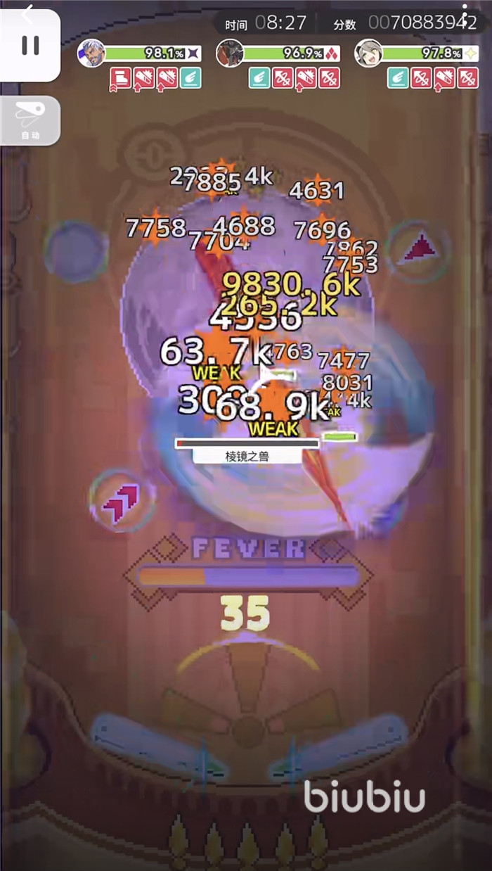第三阶段是等分身快落下时,开火狼技能,这里靠着雷机娘的浮游刷fever条,期间需要打掉boss血线,等boss出bk前开威隆技能,然后pf2结束。