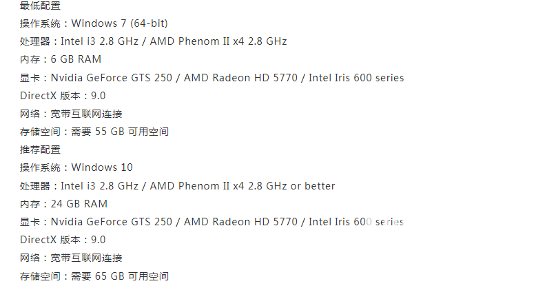 这款游戏对于电脑的配置要求也是比较低的,win7以上系统就可以体验,不过最少要预留60G的内容空间才能正常运行,玩家们可以根据小编下图所示配置要求来更新自己的电脑,最好是达到推荐配置之后在进行体验,游戏也会更加顺畅。