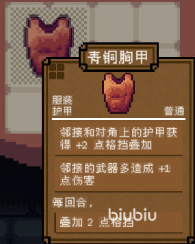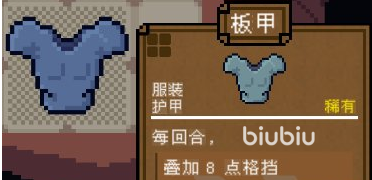小编这里着重说一下胸甲系列,胸甲包括青铜胸甲,束腰外衣,骑士护甲,钨丝袍,链甲,榜甲,大天使护甲,红色连帽衫,忍者服装等,其中以忍者服装为传说级别,能够为自身增加一点的闪避,同时在每个回合结束以后都可以移除自身100%的格挡效果,护甲系列的服装,主要是增加格挡,并且格挡增加的数值还非常的可观,所以一个好的护甲,能够为玩家带来的加成也是非常大的。