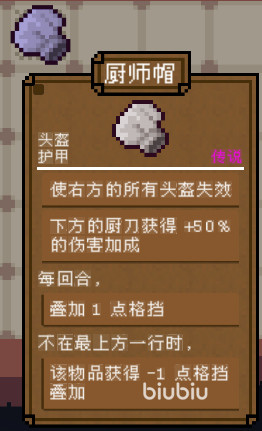 然后就是头盔护甲一类了,最普通的就是铁头盔、带刺头盔、帽子、皮帽、面具、厨师帽、巫师帽,这一类的帽子除了能够为大家增加法力以外,部分物品也是可以增加格挡和闪避的,尤其是传说级别的帽子,除了能够为厨刀获得50%的伤害加成以外,更有两点的格挡叠加,所以使用起来比较的实用。