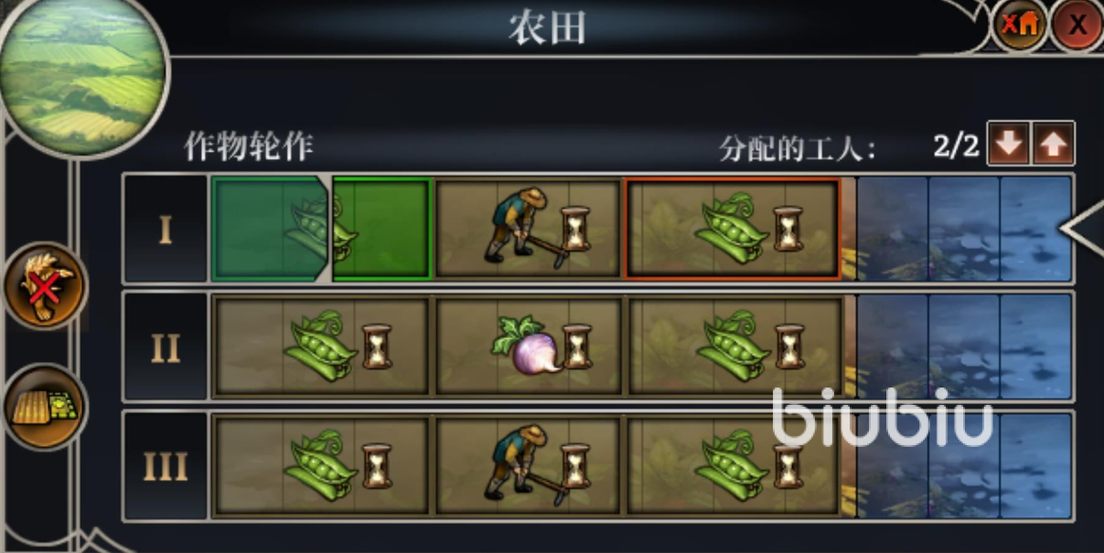 农民在游戏内非常有限,在特殊情况下可调配农民来应急。后期玩家想要扩大农田的话,只能在原有农田的基础上往四周扩散,同时收成增加了,玩家别忘了多修建地胶来储存蔬菜。