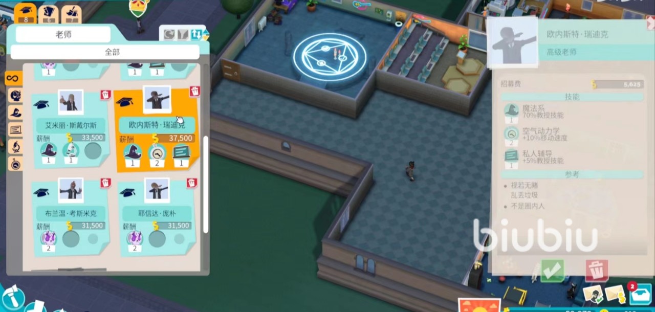 教师是游戏内非常关键的雇员,当玩家开启一个全新的学科以后,就需要配备一名拥有对应学科技能的老师。当然一些老师拥有多个学科的技能,就可以教多个学科,另外教师还会具有提升学生幸福感的其他技能,技能越多的教师佣金越贵。