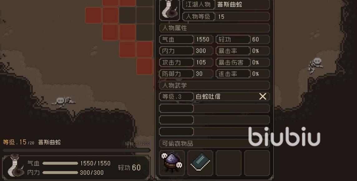 首先,在进入战斗之前,各位需要对黑风寨的蛇有一个基础的了解,该敌人的等级目前为15,对于前期的玩家小队而言是一个难缠的对手,同时主要进攻技能为单体爆发,可以在发动攻势的过程当中,对玩家们造成高额的伤害。在可偷窃物品的过程当中,一个是消耗道具,另一个则是一本武林秘籍。想要获得的话,队伍里面必须要有鬼手朱谦这的角色。